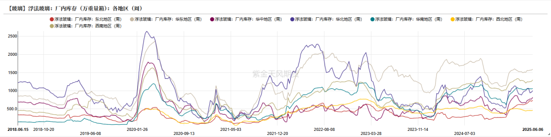 库存:中性偏空本周浮法玻璃整体累库,截至2025年6月5日,全国浮法玻璃样本企业总库存6975.4万重箱,环比+209.2万重箱,环比+3.09%,同比+20.15%。折库存天数31.3天,较上期+0.9天。
