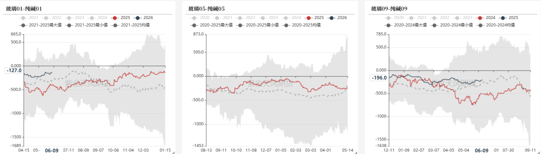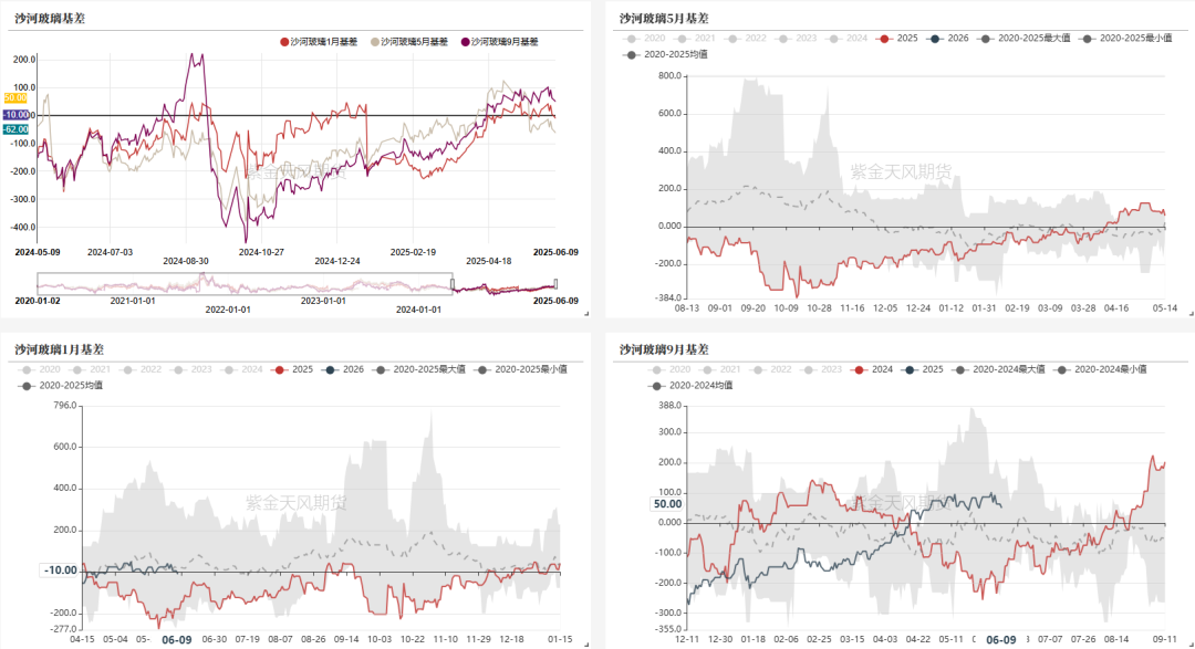 基差:中性 本周沙河地区玻璃09基差呈现走强趋势。截至2025年6月5日,沙河FG09基差为86,较2025年5月23日变动+2(环比+146.74%);沙河FG01基差为25,较2025年5月23日变动+1(环比+112.44%)。