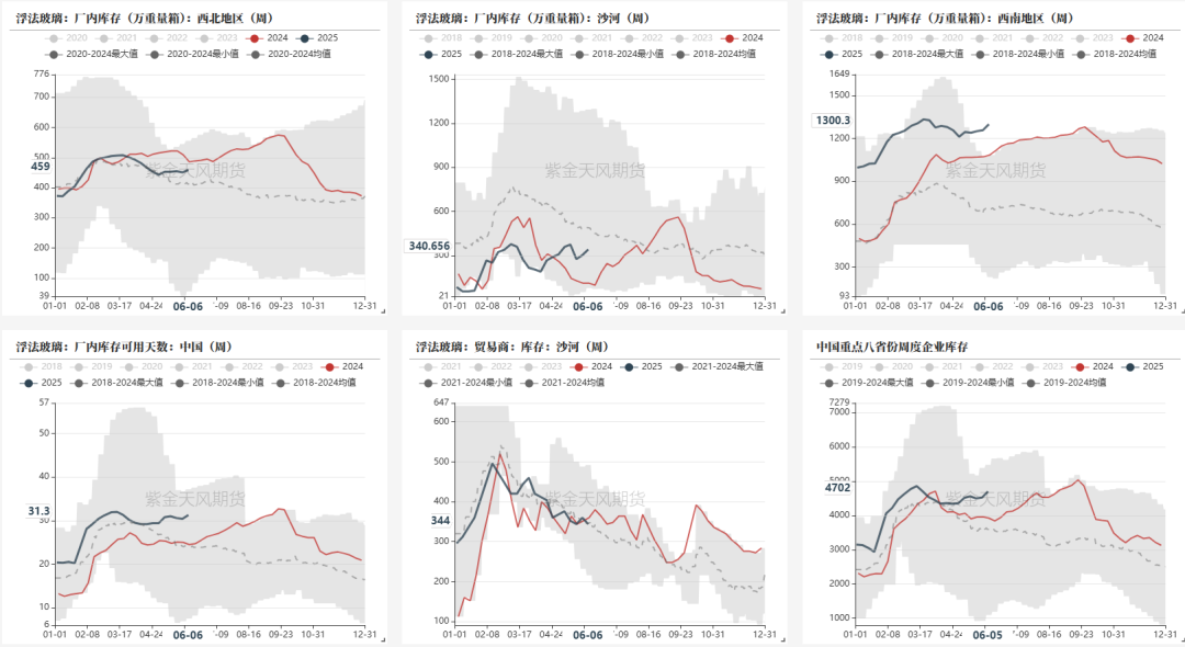 核心观点:中性 本周玻璃期货价格小幅下降。供应端,截至2025年6月5日,全国浮法玻璃日产量为15.68万吨,环比-0.6%。全国浮法玻璃周产量109.79万吨,环比-0.56%,同比-8.64%;需求端,截至2025年5月30日,全国深加工样本企业订单天数均值10.35天,环比-0.5%,同比-4.2%;全国深加工样本企业原料天数均值9.7天环比-10.2%,同比-17.1%;库存端,浮法玻璃整体累库。